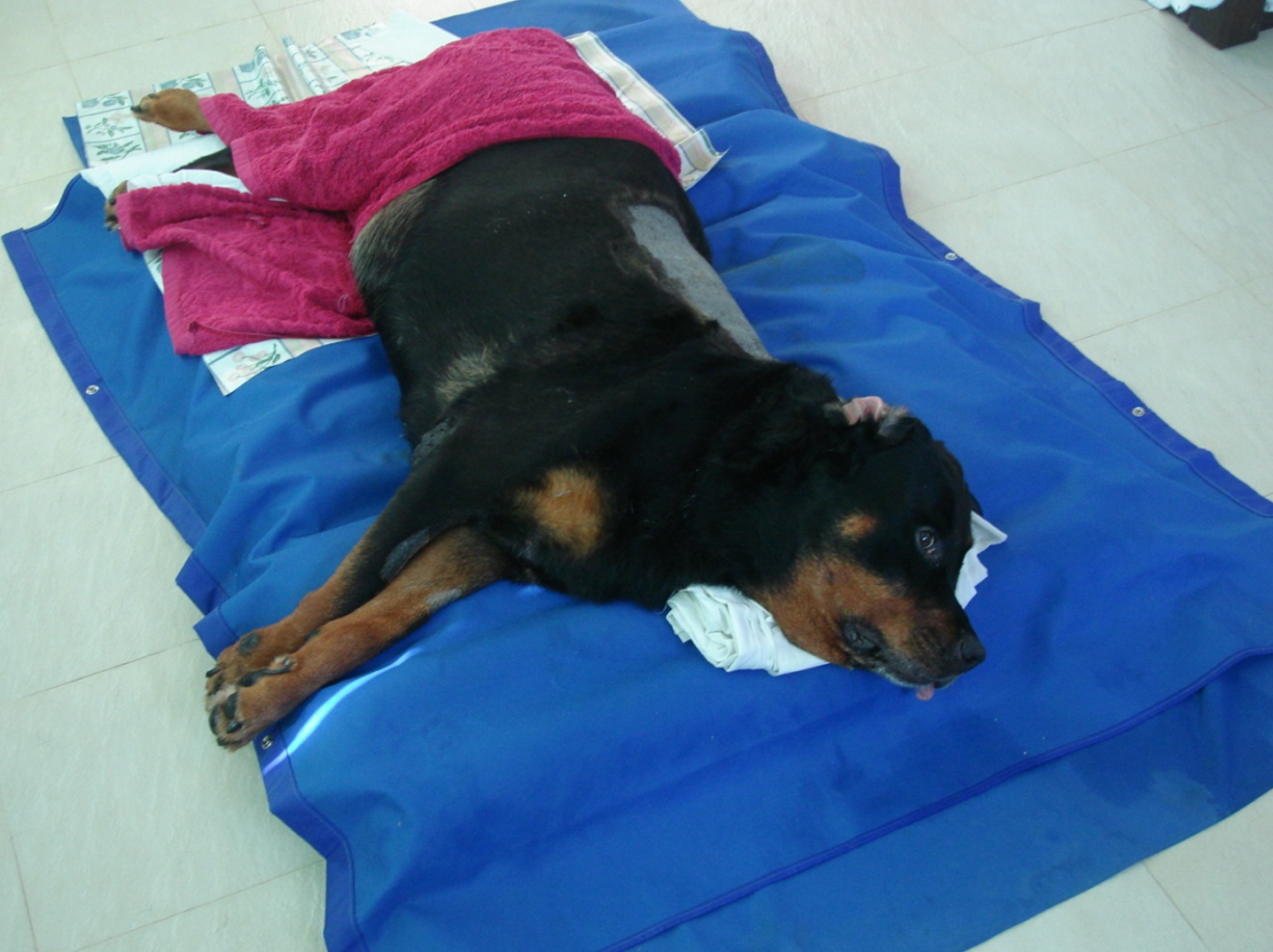 ถุงทองลืมตาขึ้นได้สักพักพี่เลี้ยงก็เริ่มป้อนน้ําจากหลอดฉีดยาให้ ถุงทองเลียน้ําจากหลอดฉีดยาอย่างตระกรุมตระกราน เนื่องจากอดข้าวอดน้ํามาเป็นเวลาหลายวัน เมื่อถุงทองเริ่มโต้ตอบโดยการเลียน้ํา สีหน้าของทุกคนก็แจ่มใสขึ้น ส่วนผมเห็น รอยยิ้ม ของทุกคนที่บ้านก็พลอยดีใจไปด้วย แต่ในใจก็ยังเกิดคําถามที่ตามมาอีกว่า สุนัขใหญ่พันธุ์ ล็อตไวเลอร์ ที่มีน้ําหนัก ตัวถึง 44 Kg. นั้นจะสามารถอยู่รอดได้จากบาดแผลกดทับได้อย่างไร?
